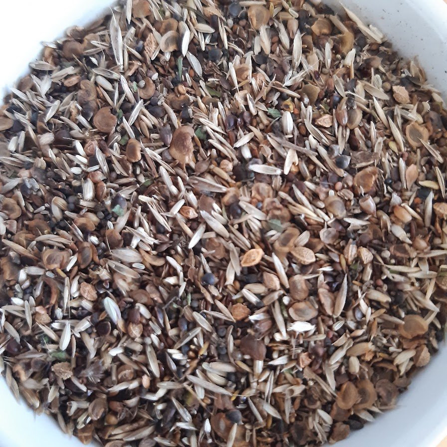 At the end of last summer during a dry week, we collected the seeds from the Yellow Rattle plants by picking a few stems from each plant and shaking them into our seed collecting bags. This seed was then ready to be sown again.