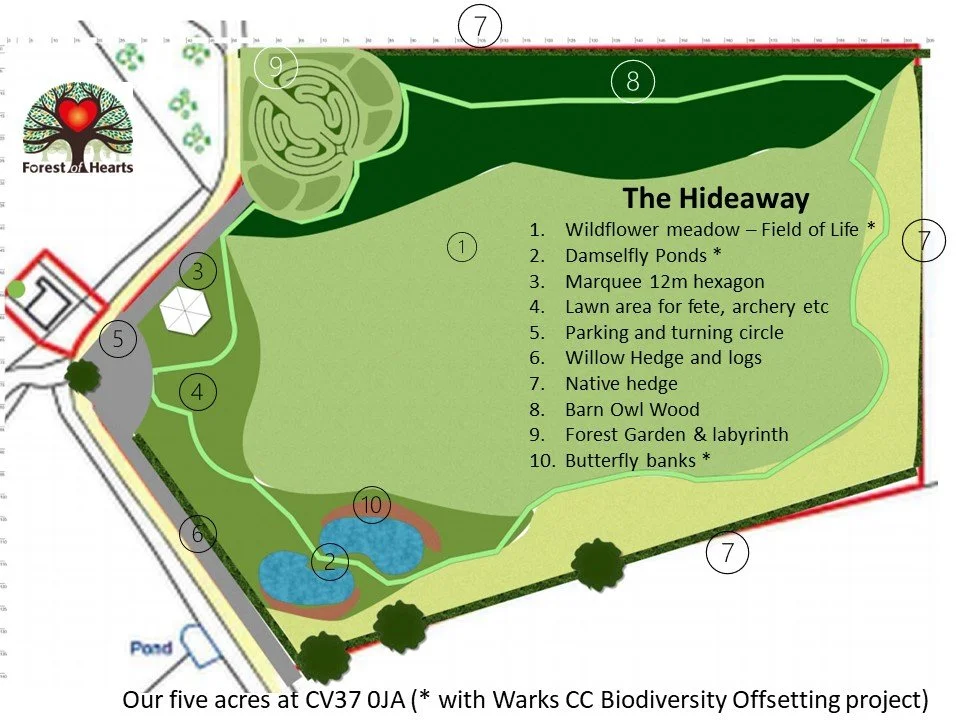 We have begun the creation of the Forest of Hearts Garden of Arden - a green space which we are transforming into a biodiverse, wildlife rich area of beauty and tranquillity, with off-grid facilities to improve wellbeing.
